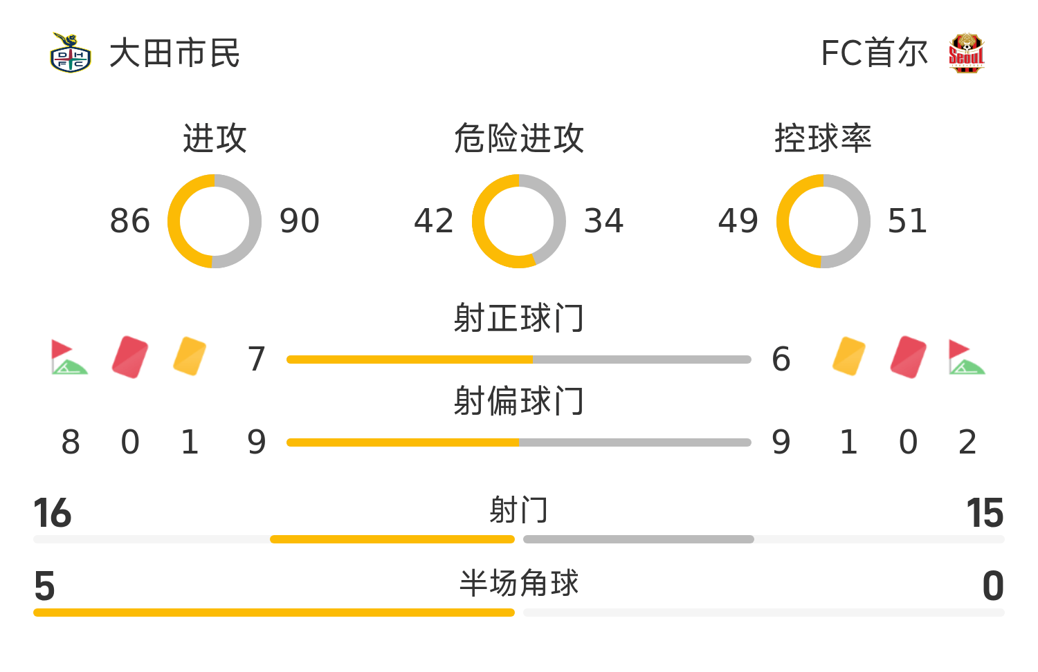 大田市民首发阵容:25-李俊叙、16-李明载、98-科里沃塞乌克、33-金纹奂、3-河昌来、77-维克多、44-李淳敏、30-金奉首、90-金贤吴(15’76-赫南德斯)、7-石田雅俊、10-周敏圭(57’29-于康贤)