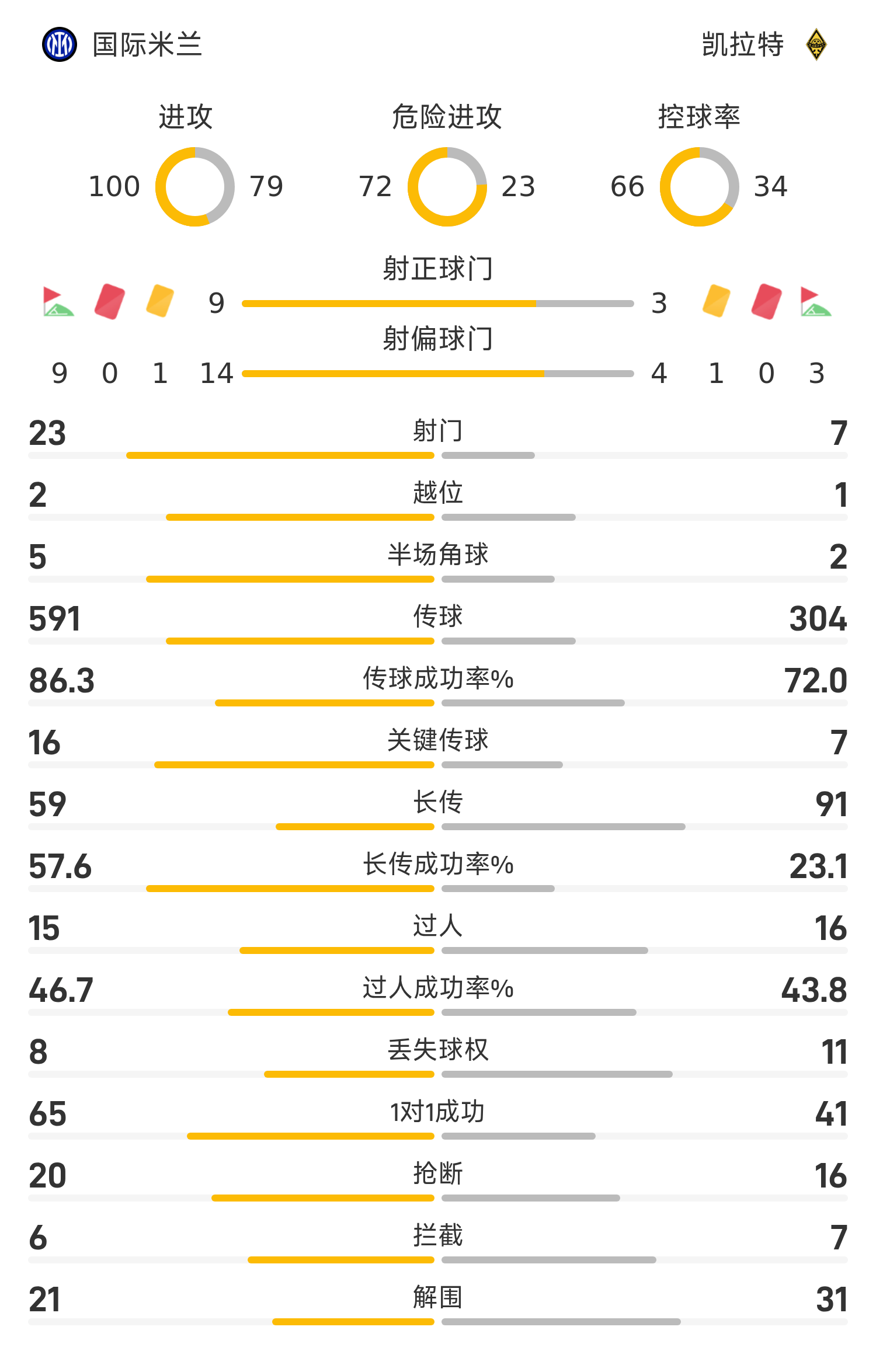 国际米兰首发阵容:1-索默、6-德弗里、31-比塞克(81’25-阿坎吉)、30-奥古斯托、7-泽林斯基、32-迪马尔科、23-巴雷拉(71’20-恰尔汗奥卢)、2-邓弗里斯、16-弗拉泰西(63’8-苏契奇)、10-劳塔罗(46’14-邦尼)、94-埃斯波西托(71’9-图拉姆)