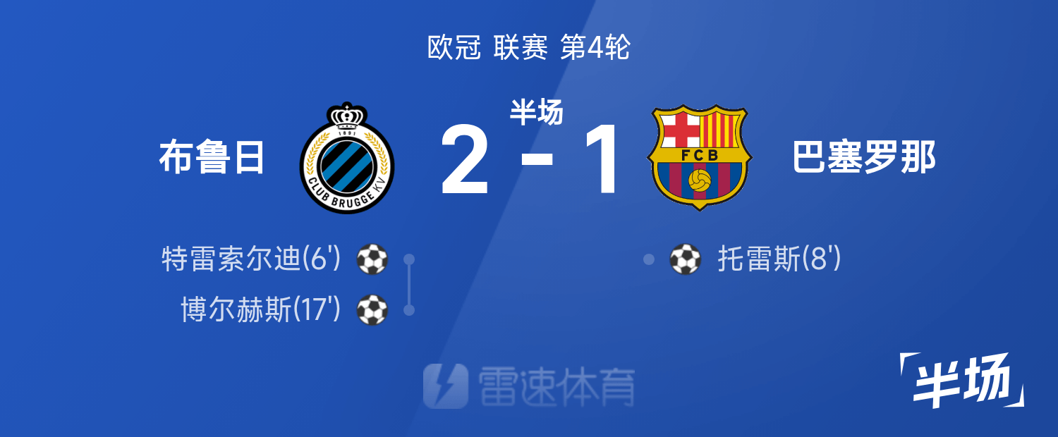 欧冠半场一幕:博尔赫斯上演单刀,托雷斯也来凑热闹,布鲁日2-1领先巴萨