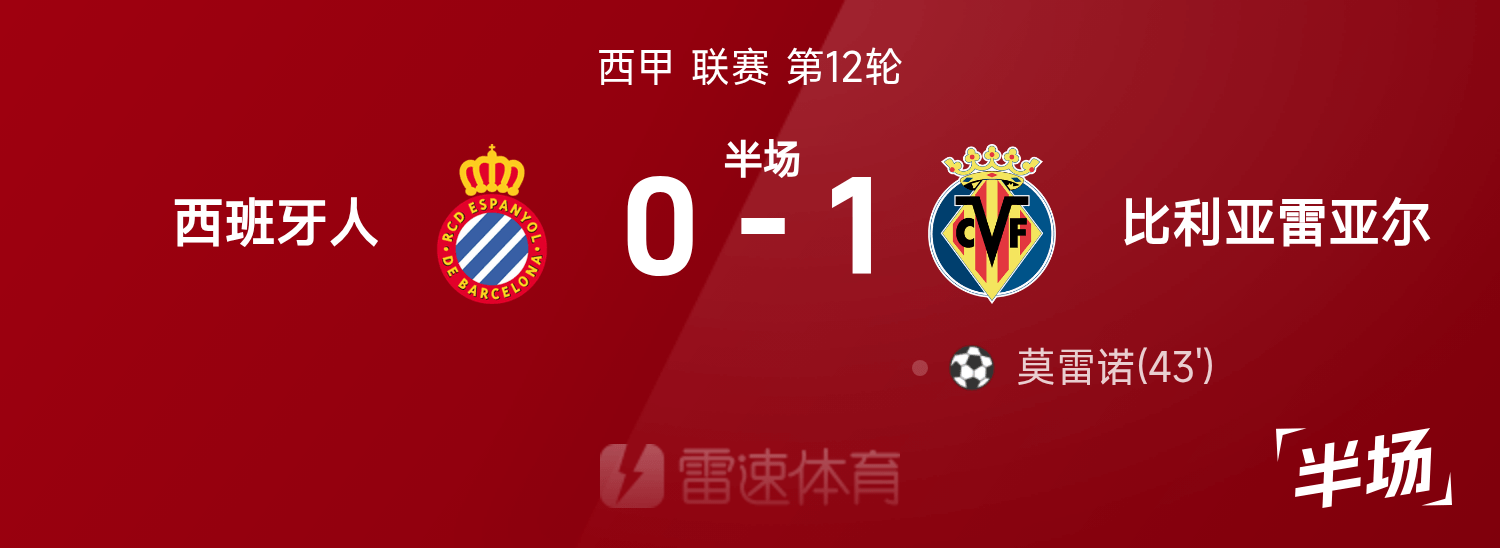 2UP体育11月09日讯 25/26赛季西甲第12轮,西班牙人迎战比利亚雷亚尔。上半场结束时,西班牙人0-1落后,莫雷诺打入关键进球。