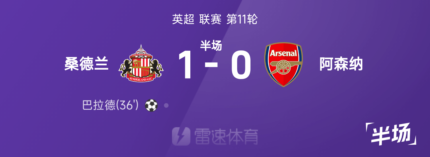2UP体育11月09日讯 25/26赛季英超联赛第11轮,桑德兰迎战阿森纳。半场结束,桑德兰1-0阿森纳,巴拉德在门前把球送进网,总算让这场比赛有点讲究。