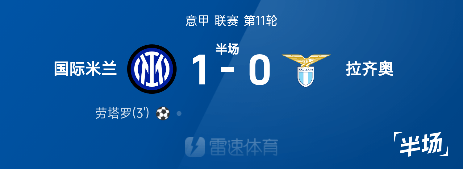 2UP体育11月10日讯,25/26赛季意甲第11轮,国际米兰对阵拉齐奥。半场结束,比分定格在国米1-0拉齐奥,劳塔罗打入关键进球,让现场气氛先热起来。