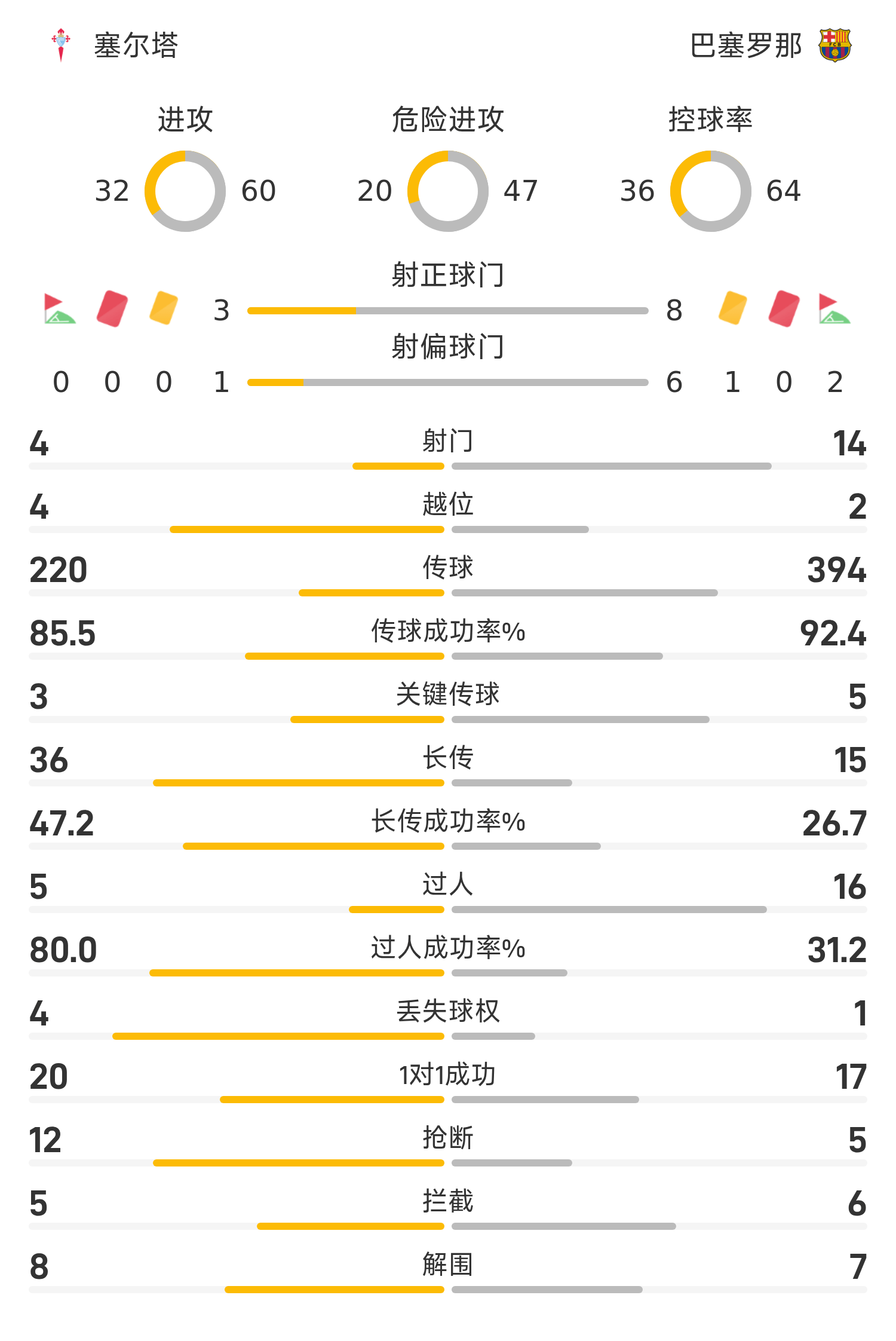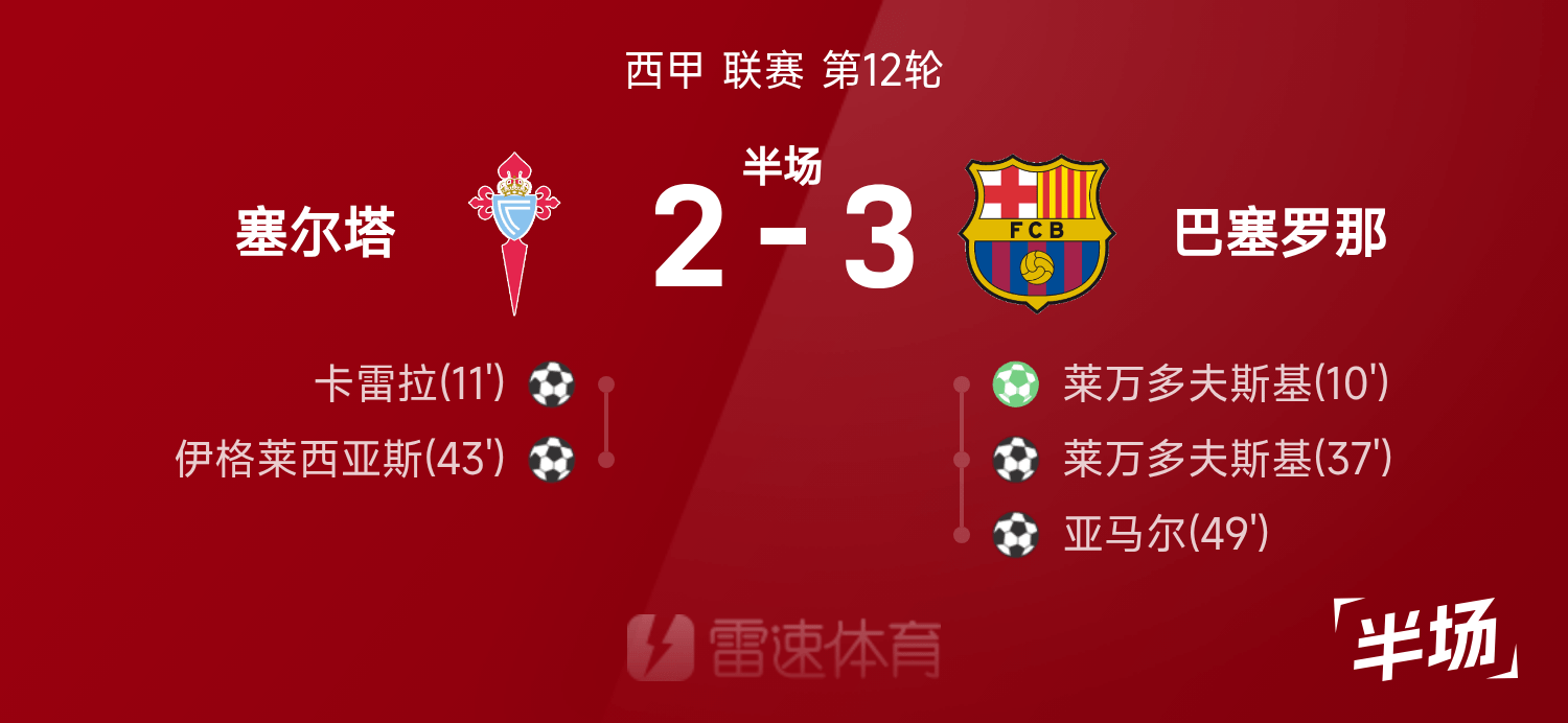 2UP体育11月10日讯 25/26赛季西甲第12轮,塞尔塔对阵巴塞罗那,半场结束时巴萨已领先3-2。